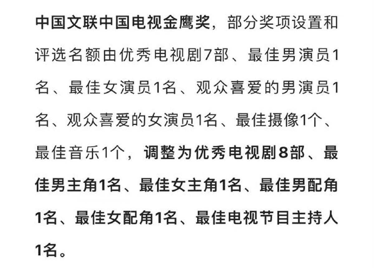 此前,一份关于《关于2022年第一批评比达标表彰项目的公示》,引起了网友们的关注,而在其中,最受瞩目的应该就是关于电视金鹰奖的调整。