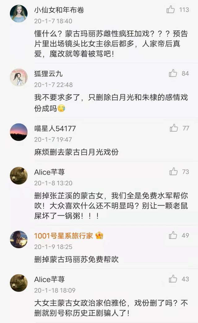 在官方放出的片花中,成毅出演的少年朱棣为逃婚参军,遇上了自己的白月光蒙古女。历史记载中,朱棣和徐后感情并未有白月光蒙古女的出现。可在片花中,蒙古女出现的镜头甚至要多于徐后,显然这并不合理。